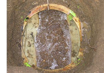 Sludge also accumulates underneath in the fine sand and gravel bed as well as in the leach lines. Sludge is what clogs the majority of the drainfield soil. An example of what sludge looks like in the tank can be seen in above. Once the drainfield soil gets completely clogged with years of sludge (and biomat) water can no longer penetrate to drain properly and the system fails and backs up. | ||